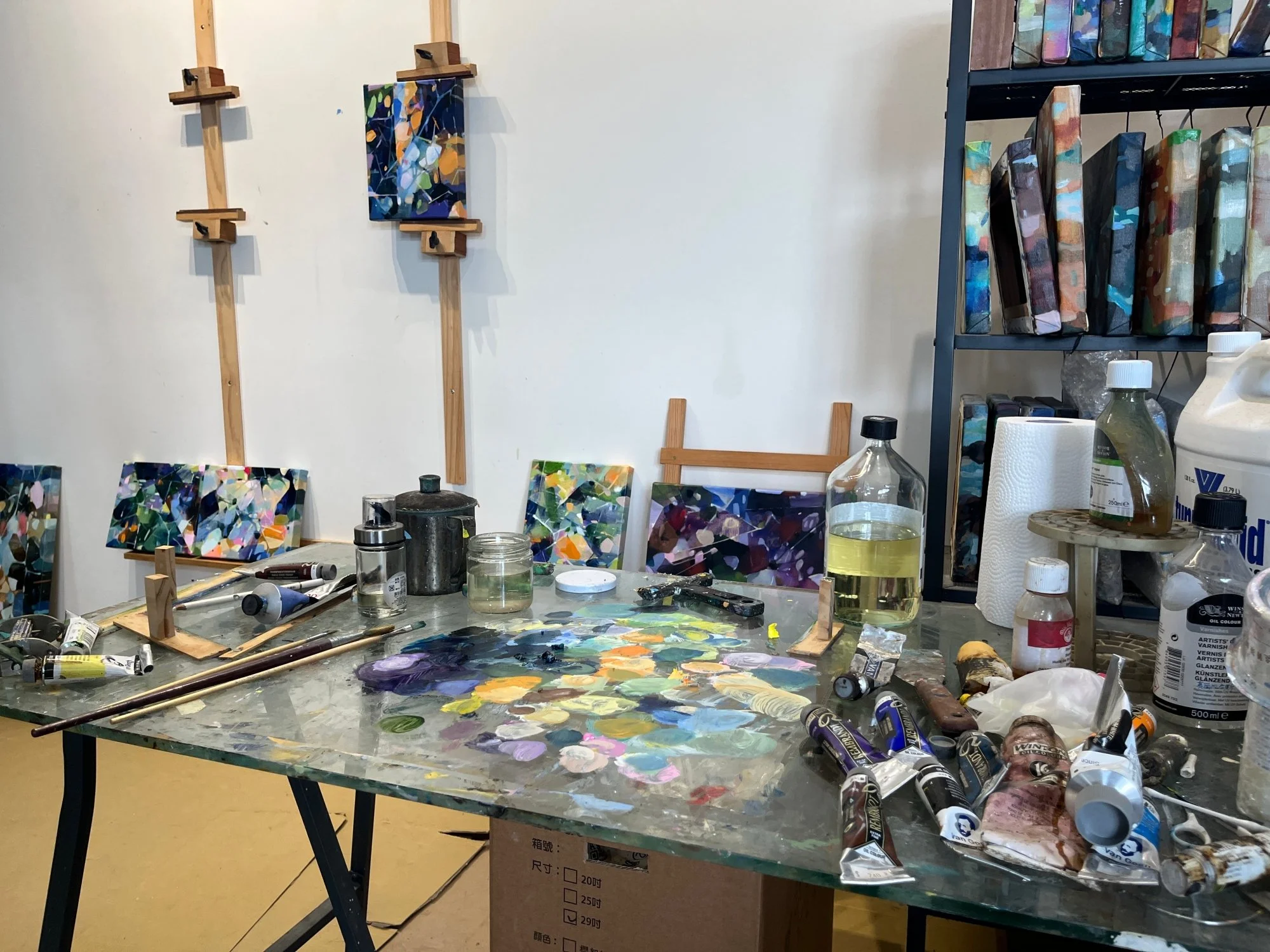 藝術家莊臥龍將傳統水墨中的「苔點」,轉化為深夜林間明滅的信號。那些點、線與色塊,不再是為了描繪具象的世界,而是像神經網路般,在畫布上自發性地跳動、堆疊。當苔點擴張成圓形的虛空,畫面便有了呼吸的縫隙。那是山壑,也是森林的出口,引導我們走進一個由筆觸與光影織就的「時空晶體」。在這裡,時間不再是線性的,而是一種層層堆疊的節奏。 邀請你放下尋找答案的執著,純粹地讓感知在流動的層次中遊走。